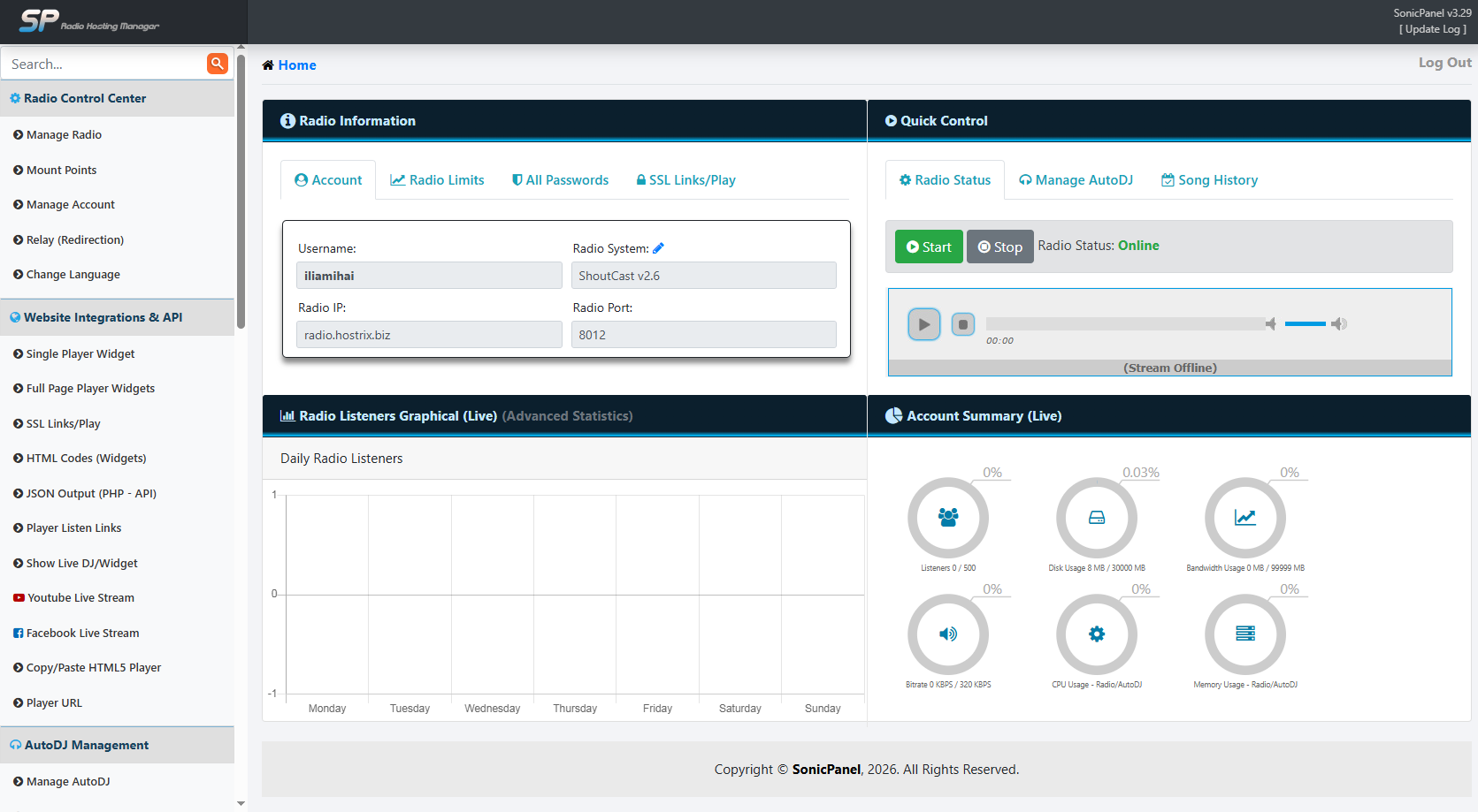 Panoul de control oferit pentru fiecare server de radio, este SonicPanel. Toate servere de radio vin cu acces FTP/Panel, avand un control total asupra serverului dvs